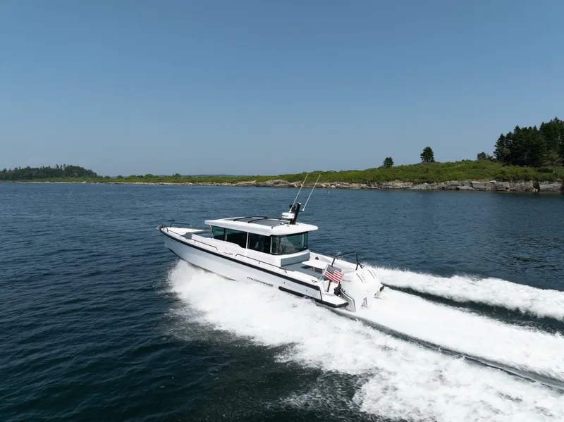 This Axopar 37 Aft Cabin will be available in Spring 2026 She's equipped with Joystick docking and a separate head compartment along with the streamlined Axopar 37 foundation making it easy to set off for Adventure!