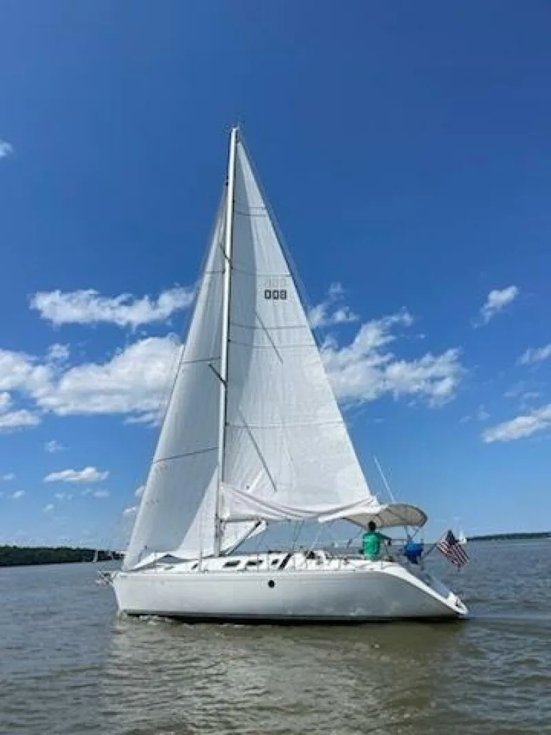 Aft Cockpit with single wheel steering and scoop transom. V-berth and head forward. Main cabin with port and starboard settees. Centerline drop leaf table. Navigation table and second head aft to starboard. Galley and double aft cabin to port.