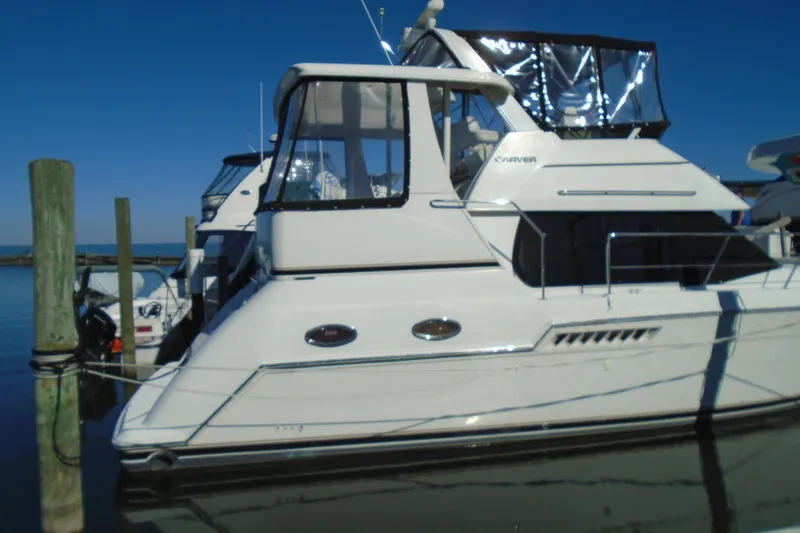 Cabin Appointments include Full AFT Master suite with Private head & Shower stall, Full Guest Stateroom forward accompanied with 2nd Full Head & Shower, Dual Station Air/Heat, Mid Salon with step-down Dinnette and large full galley. Clarion Sound System throughout. Ultra leather furnishing with rich urethaned woodwork at every turn.