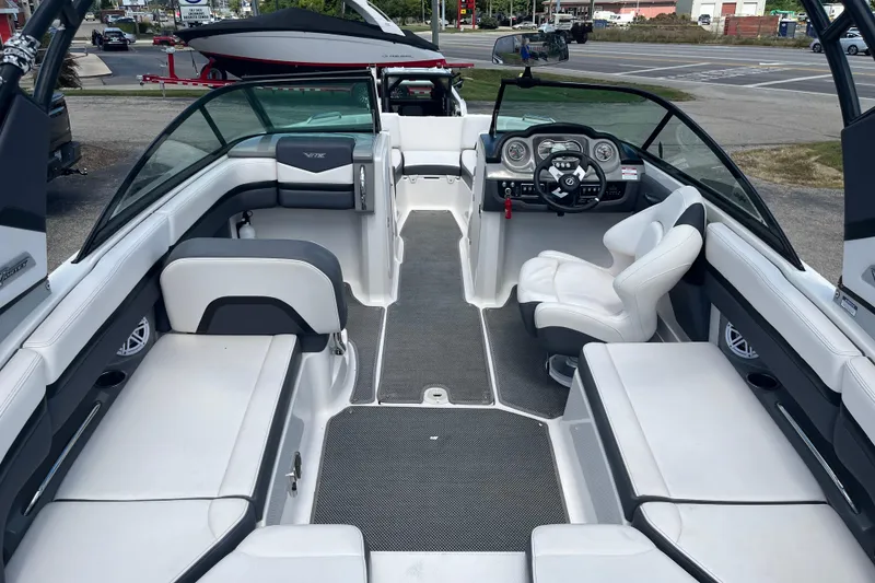 Bow & Cockpit: Expansive U‑shaped seating, optional filler cushions, full walkthrough windshield, storage beneath seats, drink holders, snap‑in carpets, and a cooler in the port bench.