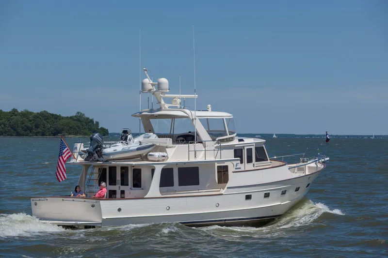 With elegant exterior lines that give it a timeless appeal paired with exceptional functionality, the Fleming 55 quickly established itself as one of the finest cruising yachts in its class when it was launched in 1986. Many features of the Fleming 55, the first model introduced by Tony Fleming, have become staples in the Fleming lineup; a dedicated pilothouse, low profile design, and fine forward entry. A semi-displacement hull with twin engine power allows for efficient cruising at displacement speeds or the ability to plane and run in the high teens when needed.