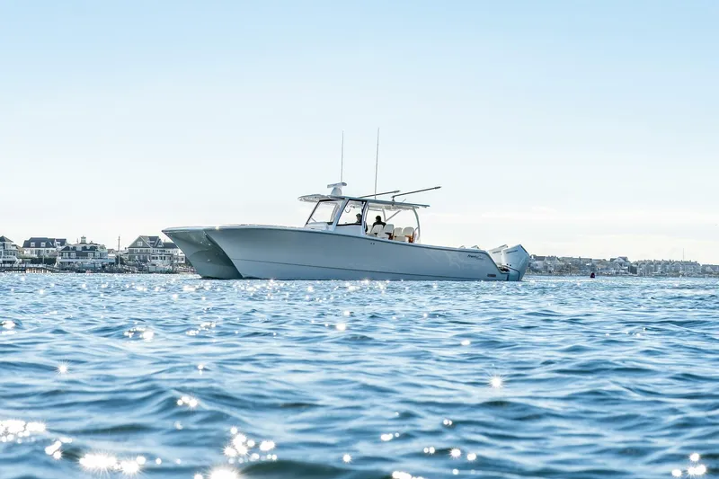 Following the success of Front Runner's 37 Cat, the new 43' model raises the bar for offshore performance and fishability. With a 12'4" beam, dual-row helm seating, large transom livewell, and two in-deck livewells, this platform was built for serious fishing and versatile family fun. Its stepped hull, lifting strakes, and flared bow deliver a smooth, dry ride with exceptional stability in any condition.