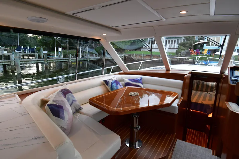 The helm station features a custom-built helm seat that offers comfortable driving positions either standing or seated as well as ample storage under the seat. Next to the helm seat is a large sliding window that offers easy access to the mid-ship cleat during docking or to the side deck.
