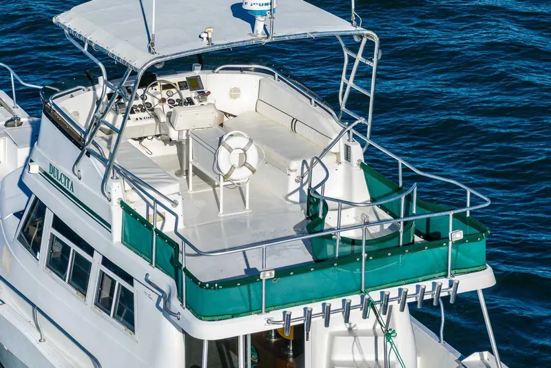 There are two state rooms and a single head forward with seperate shower. The master berth has an island queen bed and two hanging lockers. The guest state room (partially tucked beneath the galley) has a double berth. Molded steps ascend from the deck to the Mainship's large fly bridge. Although this boat was branded as a 350 Trawler, it is actually almost 40' long with the platforms included and was later rebranded as a 390 Trawler.