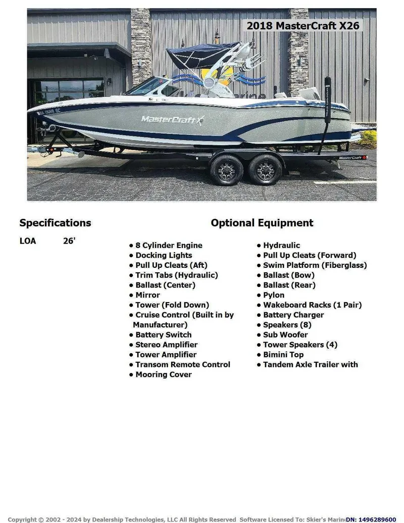 2018 MasterCraft X26, The 2018 MasterCraft X26 is a 26-foot luxury towboat known for its smooth ride and high-end performance. With the Gen 2 Surf System and a deep-V hull, it creates customizable wakes and waves for all watersports. It offers a spacious interior with seating for 18 and premium amenities like a wet bar and a powered helm seat. The X26 is powered by an Ilmor marine engine, making it ideal for large groups on big lakes.
