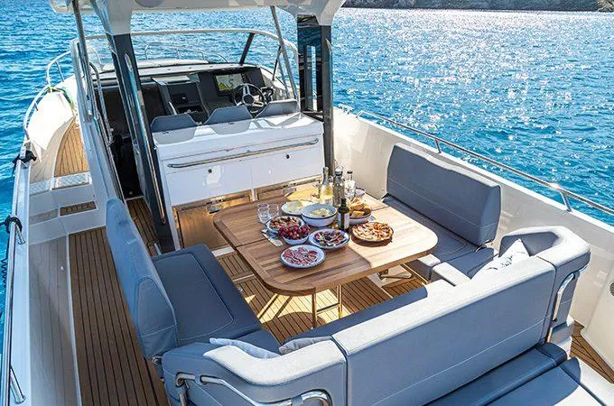 The lounge features a sizable table flanked by three sofas, which can transform into a expansive sun pad or a cozy seating arrangement with options for all seats facing forward or arranged for face-to-face conversation. The outdoor galley is equipped with drawers for utensils and dishes, a sink with hot water, and a spot for a gas stove or electric grill. A generous stowage compartment, exceeding 2500 liters, includes a hydraulic opening for convenient access from the aft deck, providing ample space for gear like SUPs, sea bobs, wakeboards, or an inflatable dinghy. The swim platform and aft deck are both spacious, comfortably accommodating multiple people simultaneously.