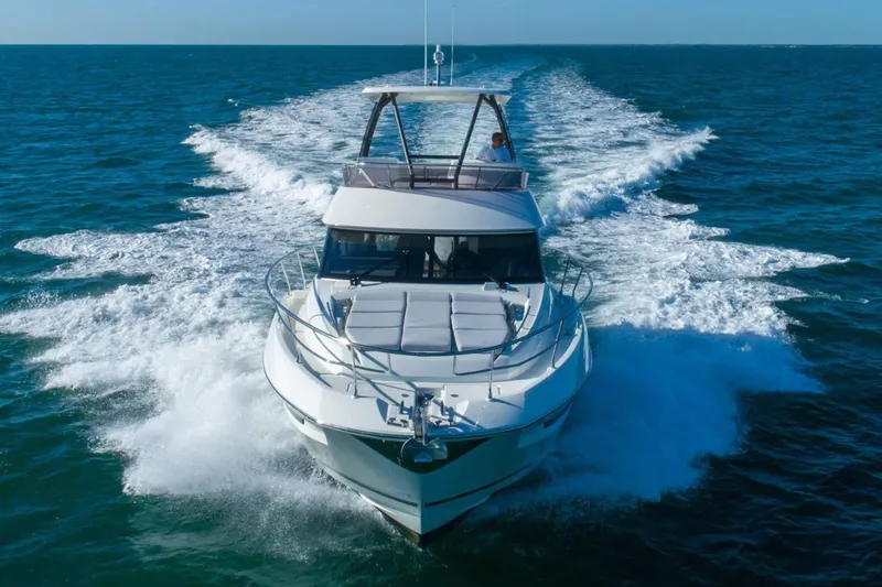 On the exterior, she features the signature style of the latest PRESTIGE Yachts, with an expanded, continuous line of windows in the hull. This Flybridge integrates the concept of the L-shaped cockpit, which allows for maximum use of space. Transformable into a very large aft sundeck, this cockpit can also house a fully equipped skipper cabin.