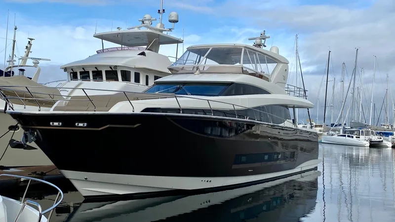 The PRESTIGE 750 combines French savoir-faire, cutting-edge technology, Italian aesthetics and unique design features. The Garroni design cabinet and PRESTIGE design department have conceived a 75-foot motor yacht that upends traditional design codes, offering an outstanding level of comfort and a contemporary design.This motor yacht has been designed to fully enjoy being at sea, whether on open waters or at anchor, with multiple living spaces on deck, including a vast cockpit and an immense terrace on the flybridge.  Bathed in light, the forward owner’s cabin is a quiet, intimate living space with a private access, a large walk-in closet, a wide desk, an independent head and shower compartment. Sumptuous living spaces, easy movement about the deck, excellent sea keeping, and that unmistakable PRESTIGE style...