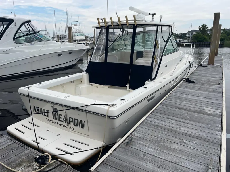 The 2003 Pursuit 3000 Express "Asalt Weapon" is a 30-foot express cruiser designed for both fishing and cruising. It features a 10'6" beam with a fish friendly cockpit and is powered by twin Crusader 6.0 MPI engines. The boat is known for its smooth, dry ride and its ability to handle rough weather. This is a well equipped boat that includes a Kohler 4KW generator and upgraded Captain's Choice Crusader 6.0 engines. The electronics are operational but dated and features dual electronic control helm. The vessel has been un-attended for some time due to death in family and interior has some water damage to wood trim and cabinets. The headliner has been removed and leaking hatches have been attended to. The exterior of the boat shows beautifully and she has gorgeous lines. This vessel is offered as is and is a gem for someone looking for a solid fishing platform.