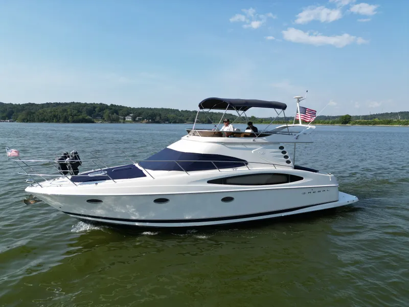 The Regal Commodore 3780 is a sedan bridge yacht with an innovative design that utilizes the full breadth of a 13-foot beam belowdecks, providing six feet, five inches of headroom throughout the entire salon. The 3780 features two sunpads - one forward and one on the bridge, and the upper bridge seats six comfortably. The helm features a tilt stainless steel steering wheel, aluminum dash panel, and easy-to-access switches and gauges. The bridge is accessed via extra-wide, molded-in fiberglass steps with a stainless steel handrail. Belowdecks, the midcabin has its own privacy door and features two convertible twin berths, a hanging locker, and drawer storage. The dinette and salon are complemented with two overstuffed chairs and an entertainment center. An extra-wide stairway provides access from the cabin to the cockpit. The wrap-around dinette features a hi-lo amber pear wood table with Corian trim. The table drops to convert the dinette to a queen-size berth. Behind the dinette is an easy-access electrical panel with both AC / DC breakers. The galley features Corian countertops with a hidden two-burner stove, a coffee maker, refrigerator / freezer, and microwave. The over-sized curved glass windshield provides ample light to the cabin during the day. The forward stateroom is graced with a queen-sized island berth, two hanging lockers, and an entertainment center featuring a TV / VCR combo. Drawer storage and a deep storage locker are located beneath the island berth. The head features a Corian vanity, mirrored overhead cabinetry, a standup circular shower stall with swivel door, and a vacuflush head.