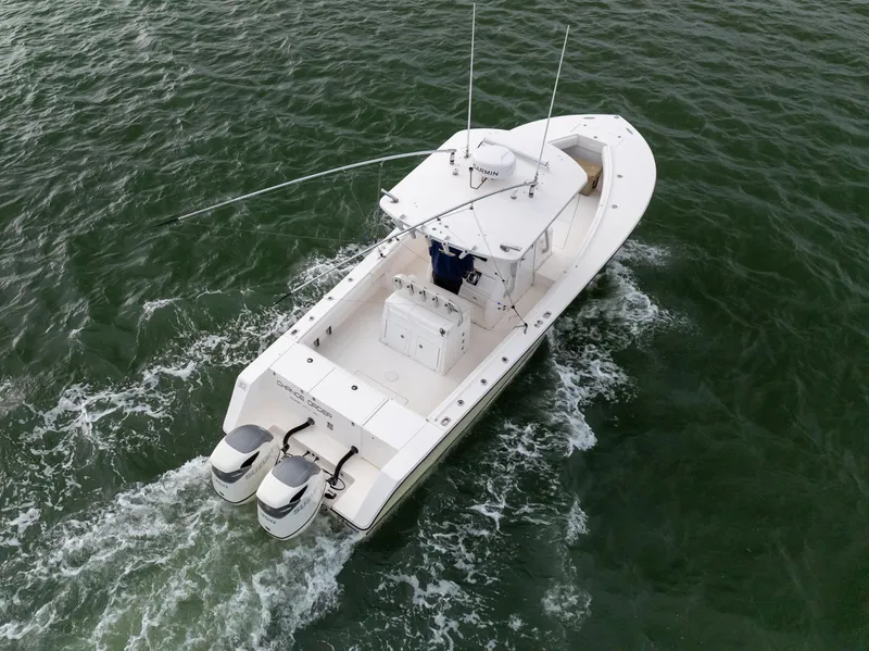 Designed by legendary Naval Architect Lou Codega, Regulator's 32' Center Console is powered by twin 250 Yamaha engines. Fishing enthusiasts will appreciate the 32's many fishing amenities, the long-range capability of the 310-gallon fuel tank, and the 35-gallon freshwater capacity.