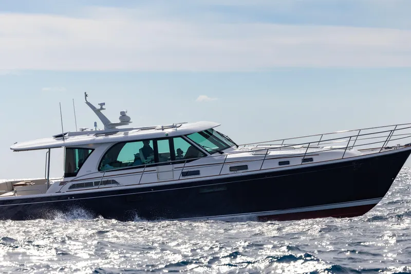 The Sabre 51 Salon Express is designed to elevate every moment on the water. With intuitive joystick controls, Volvo IPS propulsion, and advanced digital systems Sabre Connect, you're always in command-whether cruising at speed or docking with precision. Expansive cockpit seating and a versatile foredeck lounge, complete with a stowable sunpad and twin seats, create inviting spaces to relax, gather, and take in the view. Below deck, the experience is equally refined. A galley-down layout keeps the salon bright and open while providing generous pantry storage for extended cruising. Two spacious staterooms, each with a private ensuite head, offer quiet retreat, and an optional third berth with its own head gives you the flexibility to host additional guests. Every detail of the 51 is crafted for comfort, connection, and confidence underway.