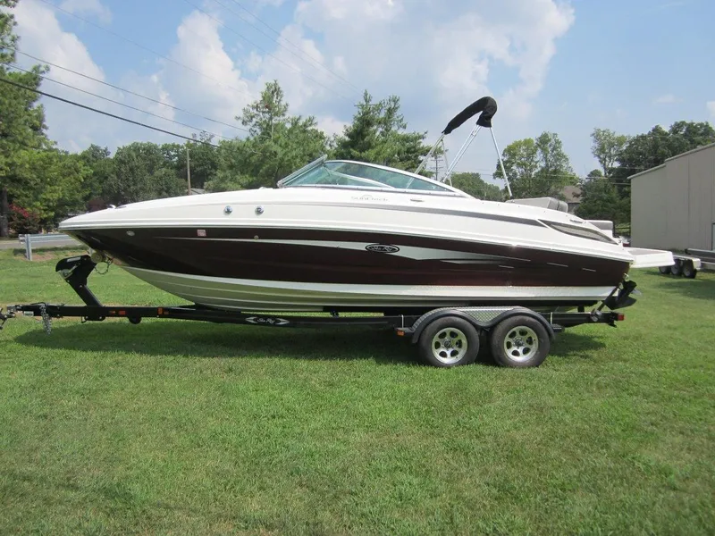This boat comes on a tandem axle trailer with brakes, and spare tire.