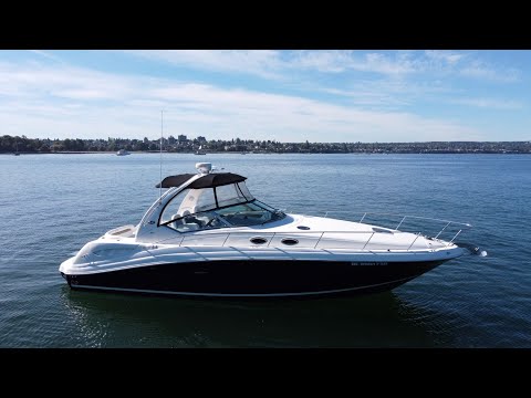Four steps down into the cabin, the 340 Sundancer is impressive with a bright wide-open salon featuring deep cherry wood high gloss finishes and large mirrors throughout. The galley has an impressive amount of counter space along with a 2-burner electric stove, microwave oven and refrigerator. There is a dinette table on starboard that has seating for four and can convert into an additional berth when needed. Ample storage space throughout is in a combination of drawers, lockers and closets.