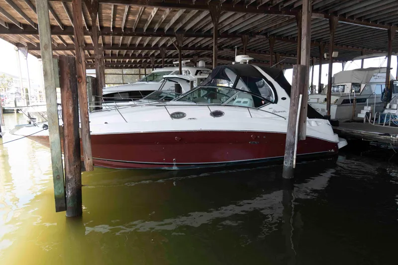 This burgandy hulled 320 shows great and the sellers have taken great pride in how the boat shows. Newer canvas with clear slantback looks great. Cockpit upholstery and interior do not show any wear and show well. Twin FWC Merc 350 V Drives and Kohler Generator. CALL THE LISTING BROKER FOR MORE DETAILS.