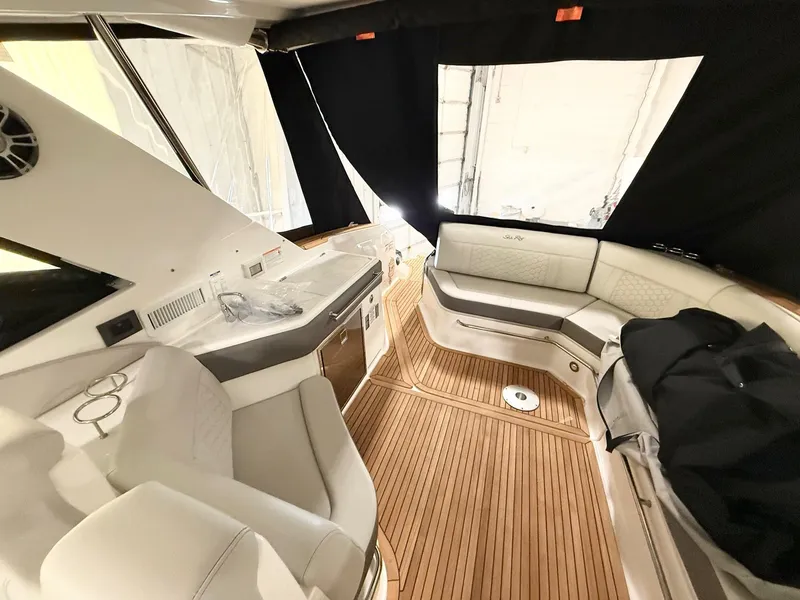 Stock #2549 | Call for Sale Price! features a Horizon hull side color with white bottom and Onyx Black boot stripe, black canvas, grey flooring, stone cockpit upholstery, Driftwood interior, twin T-ECT 6.2L 350 HP Axius B3 sterndrives, fiberglass hardtop with opening canvas, extended sunshade with ski tow, teak flooring in the cockpit, bow, and swim platform, cockpit cover, transom sun pad seating, automated submersible swim platform, stainless anchor with all-chain windlass, fender clips, flag pole with U.S. flag, RGBW LED lighting with thru-hull lights, docking lights, dual digital dash with SmartCraft Connect, radar, premier stereo with cabin and cockpit zones, VHF radio, Sirius satellite radio, air conditioning and heat, gas generator, inverter, dual-voltage cockpit refrigerator, built-in electric cockpit grill, cockpit table with teak overlay, flat-screen TV in the V-berth, and bottom paint.