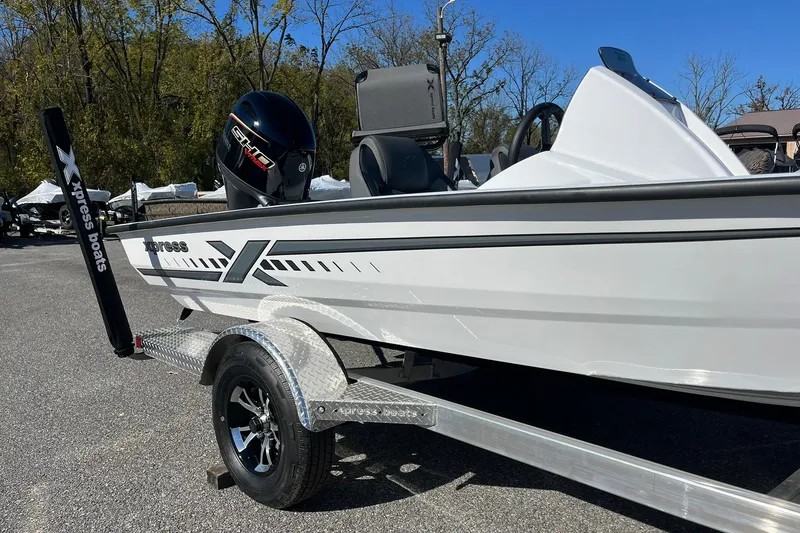 2026 Xpress H18 Crappie. 18’ crappie boat. white hull & liner. grey Seats. Seadek in grey.