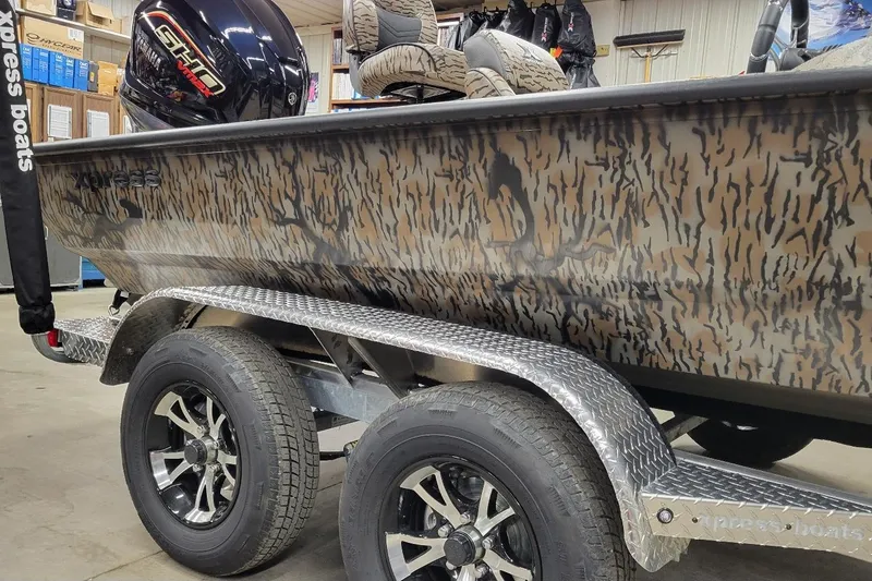 2026 Xpress X19 Pro Bass. duck boat package, camo hull & liner, camo seats. Seadek in cappuccino/black.