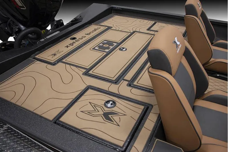 2026 Xpress X21 Pro Bass. Charcoal hull & liner. Saddle seats. Seadek in cappuccino/black.